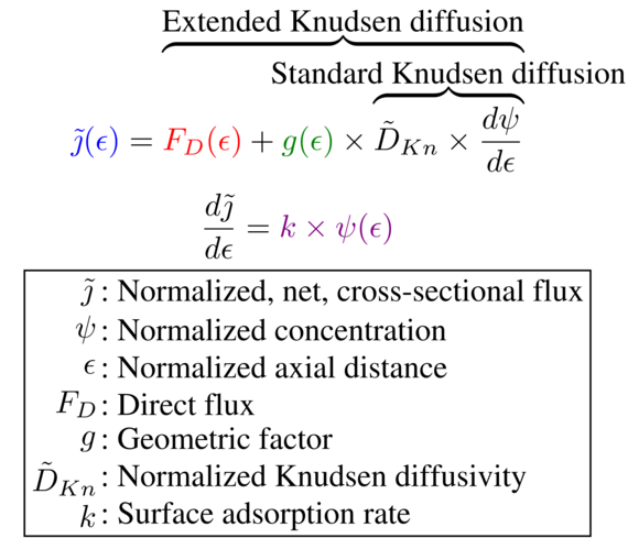 A schematic representation of the mass balance is shown in Fig. 1. This results in a system of coupled ordinary differential equations, represented in Fig. 2, which makes the differences with respect to standard Knudsen diffusion explicit. In Fig. 3, we compare the extended Knudsen approach to both our reference discretized radiosity model and standard Knudsen diffusion for the case of a finite cylinder of AR 50 and a sticking probability of 1%. In summary, our extended Knudsen diffusion approach offers an alternative to conventional radiosity models, particularly for the challenging low sticking regime.