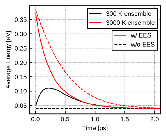 Fig. 1: Dashed curve: Energy relaxation due to electron-phonon scattering in silicon at 300 K. The solid line shows a stronger energy relaxation for the hot-carrier ensemble due to EES. The mean energy of the cold ensemble is temporarily increased. The initial two-particle distribution function assumed is a product of a cold Maxwellian at 300 K and a heated Maxwellian at 3000 K.