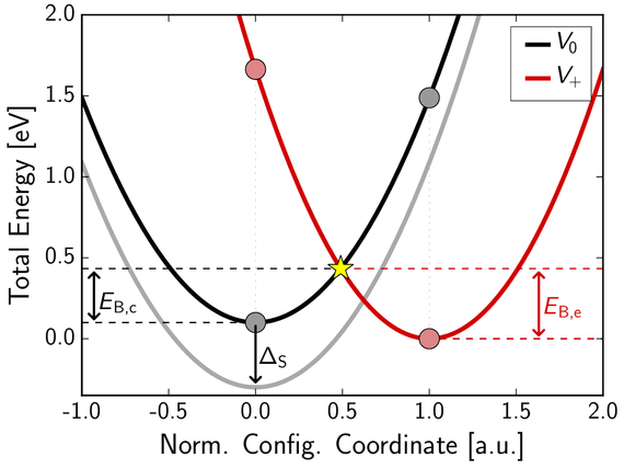 Fig. 1: PESs for different defect states can be approximated by parabolas. In the classical limit of NMP theory, the transition barriers are determined by the intersection point of the two PESs.
