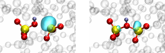 Fig. 2: The neutral (left) and positively charged (right) states of the hydroxyl-E’ center in amorphous SiO2. The turquoise bubbles represent the HOMO and LUMO orbitals in the neutral and positive state, respectively.