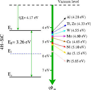 Energy band diagram of the selected metals and 4H-SiC.