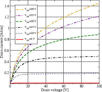 On-state characteristics of DMOSFET at 300K for 6H-SiC (left), and 4H-SiC