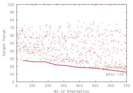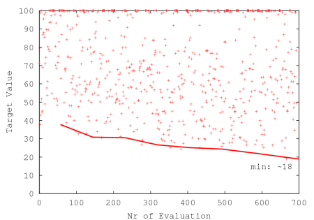 Several experiments with different crossover and mutation probabilities were carried out. Fig. 5.17 and Fig. 5.18 depict the evolution of the genetic algorithm for two different combinations of crossover and mutation probability and crossover method. The solid line is a plot of the best individual of each generation. Note that the best individual within a population sometimes occurs at a lower evaluation number thus appearing below the solid line. The parameter combination depicted in Fig. 5.17 leads to the best result for our application.