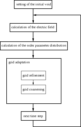 The complete adaption of the grid is reached by sequential invoking of the grid refinement and of the grid coarsening algorithm.