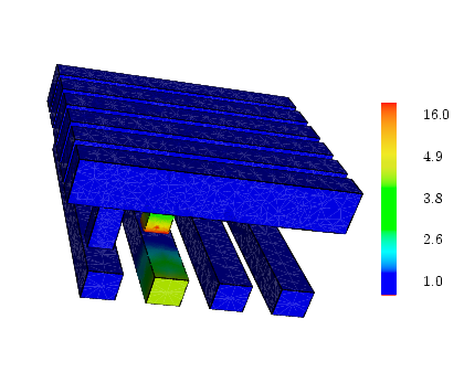 The simulation of the electro-thermal problem was carried out with the SAP [91] tool and the simulation of mechanical stress and electromigration problem with FEDOS tool. The simulation results are presented in the Figure 4.18 - Figure 4.20. We can see in Figure 4.18 electrical potential distribution. The gradient of the electrical potential determines direction and intensity of the electromigration driving force.