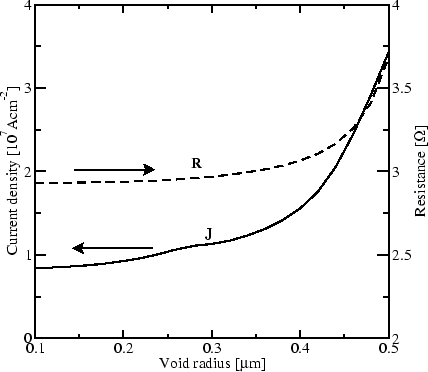 For an electrical field calculated in such a way, the resistance of the interconnect via is also calculated [76,91]. With growing void size the resistance increases. The whole process is stopped when a void radius is reached for which