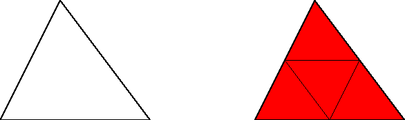 One method to perform such a refinement, is called red-green-refinement. This refinement technique is a commonly used refinement method for two-dimensional applications, especially for Delaunay grids. A triangle to be refined is split into four smaller children -- so called red triangles, as shown in Figure 2.13. At the intersections of the triangle edges, new points are inserted. Thereby four triangles are generated, whose edges are connected to these points. A pleasant property of this method is that all new triangles are geometrically similar to the original one and thereby the element quality of the new triangles is the same as the quality of the original one. A positive aspect is that usually the condition of the resulting equation system will not become worse by the refinement -- but it is also not improved.