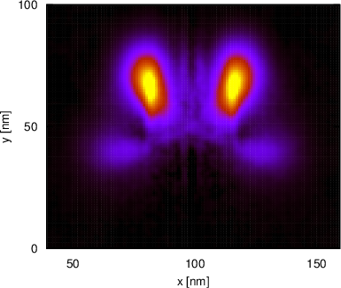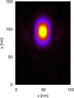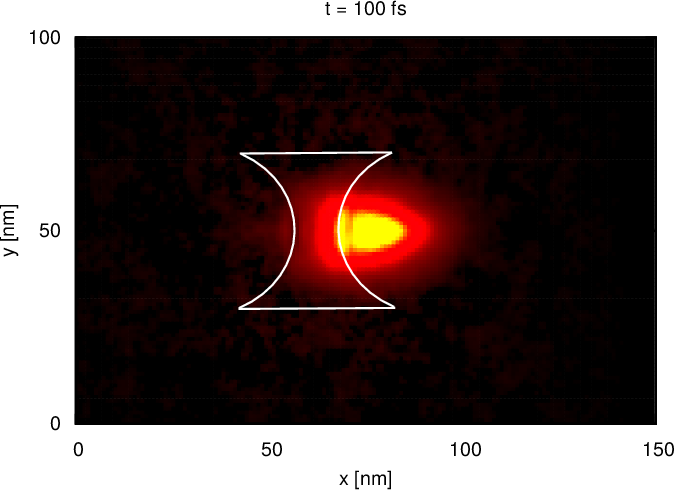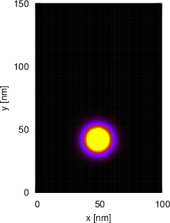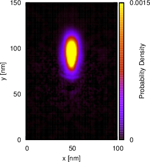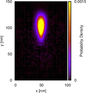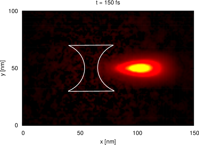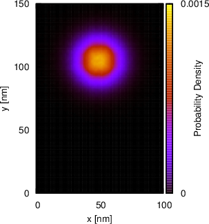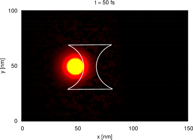 The potential shape used to form the electrostatic lens is shown in Figure 6.3. The electrostatic lens has a peak potential energy of 40meV and the wavepacket is initialized with a kinetic energy of 180meV, moving rightwards. The electrostatic lens clearly focuses the wavepacket (density) after 150fs of evolution. A comparison to the evolution without a lens is shown in Figure 6.4, using a similar setup in the vertical orientation. A further consideration for designing the lens is that the size of the lens should be larger than the De Broglie wavelength of the electron (determined by its energy), otherwise an effective focusing will be distorted by diffraction effects.