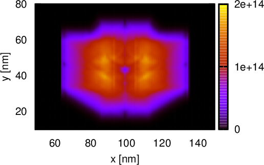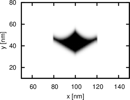 Figure 6.6 shows a rhomboid-like potential shape, along with the corresponding generation rate, which forms a lens that is able to realize such a function. The behaviour of the lens can be manipulated by changing the magnitude of the potential. This can be done dynamically, if the lens is realized with a structure similar to the one shown in Figure 6.1, using a time-dependent potential bias on the contact. Figure 6.7 illustrates the effect of the lens at different potential values. The density peaks indicate regions with a higher probability to find an electron. In Figure 6.7b (peak potential energy 70meV) the wavepacket almost fully traverses the lens and is split into two parts. The same lens shape, but with a potential energy of 120meV, splits the wavepacket into four parts (Figure. 6.7b): The front edges splits off a portion of the wavepacket by reflection, while the concave-shaped rear edges focus the transmitted parts again (applying the principle of Section 6.1.3). In the first case, with two peaks (the most-probable components of the state), the y-component of the wavevector remains positive, whereas for the second case, at a higher potential energy, the wavevector of the scattered state also has a negative y-component. This example clearly illustrates how specially shaped potentials can be used to influence the scattering pattern of an electron wavepacket. By varying the potential energy the electron can be guided in a certain direction with a controllable probability. This can be of use in the field of quantum computing to generate a (modifiable) entangled state and direct it to other computing elements.