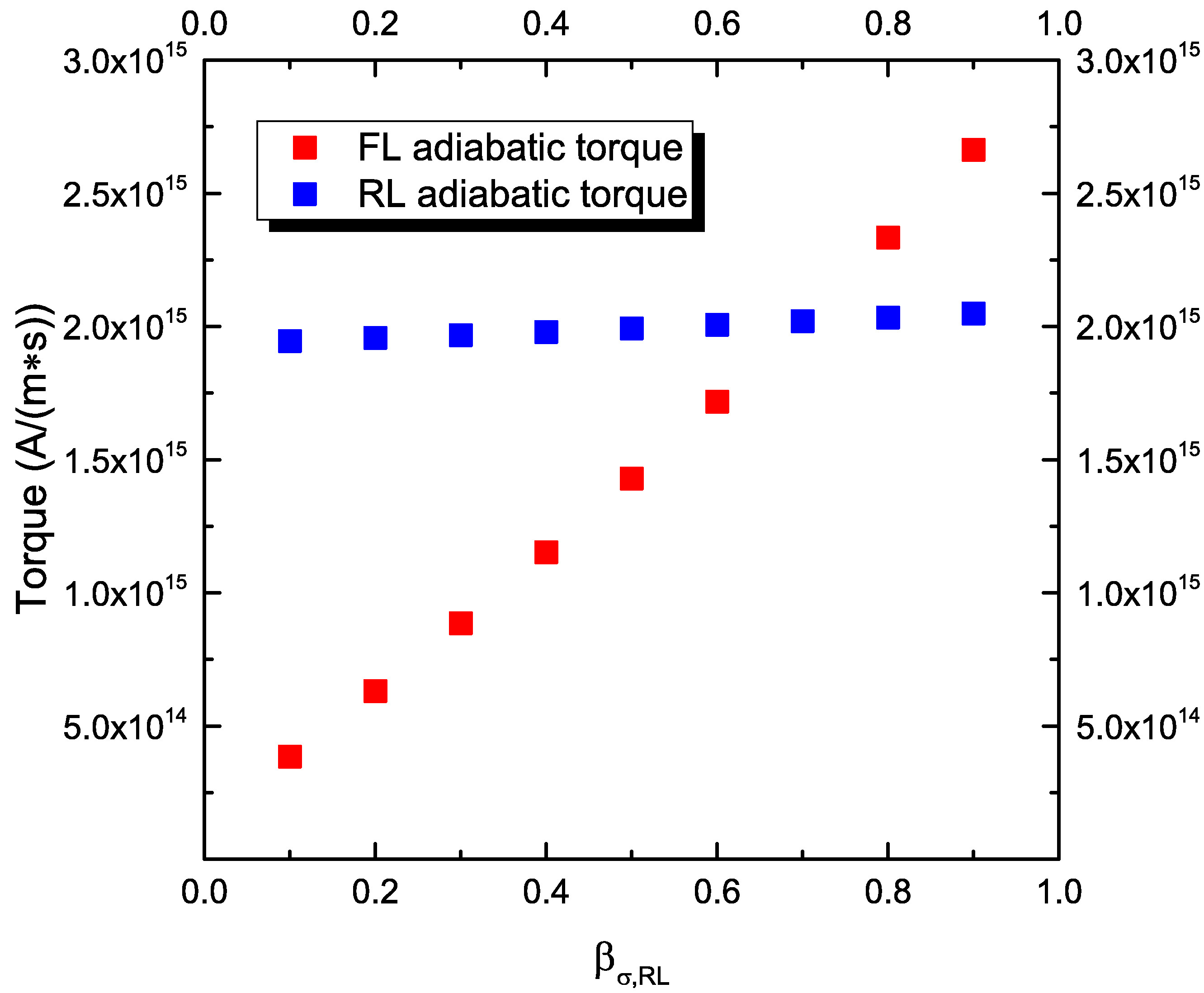 Fig. 7.12(b) then shows the dependence of the FL adiabatic torque on the conductivity polarization of both the RL and FL. For any value of \(\beta _{\sigma \text {,FL}}\), the value of the torque in the FL still shows the same linear dependence on the polarization of the RL, and it is almost constant with respect to the one of the FL. This behavior is compatible with the dependence on \(P_\text {RL}\) and \(P_\text {FL}\) expected from the adiabatic component of the Slonczewski torque term in (3.47), which, for the FL of the structure under study, takes the form