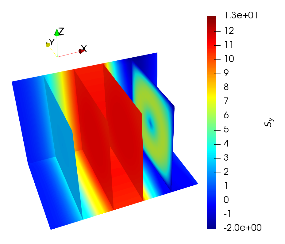 the built-in MFEM meshes. The magnetization distribution is taken to be parallel in the center of the structure, and anti-parallel on the sides. The potential is fixed with Dirichlet conditions on the left and right boundaries. The