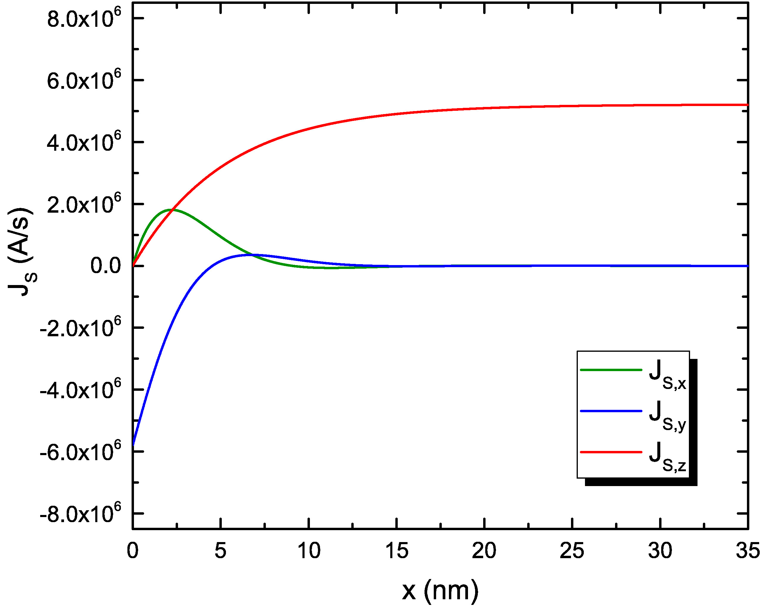 Equations (6.13) and (7.3) should give compatible values for the torque, provided that \(\lambda _\text {J}\) is shorter than \(\lambda _\text {sf}\). This is usually the case for most ferromagnetic materials [98], [151]. In order to check the validity of these assumptions, the torque obtained from both expressions is compared. First, the spin current flowing in the x-direction, \(\vb {J}_\text {S,x}\), is computed from the spin accumulation solution of Fig. 7.3 using (6.6), and is reported in Fig. 7.4(a). It can be noted, that near the interface the spin current is fully polarized along the direction of the magnetization in the RL. The component parallel to the RL magnetization is quickly absorbed. Precession of the spin current around the FL magnetization direction creates a component in the x-direction, perpendicular to the common plane of the magnetization vectors in the RL and the FL. This component is also absorbed on the length scale dictated by \(\lambda _J\). The spin current gets then polarized in the direction of the magnetization in the FL.