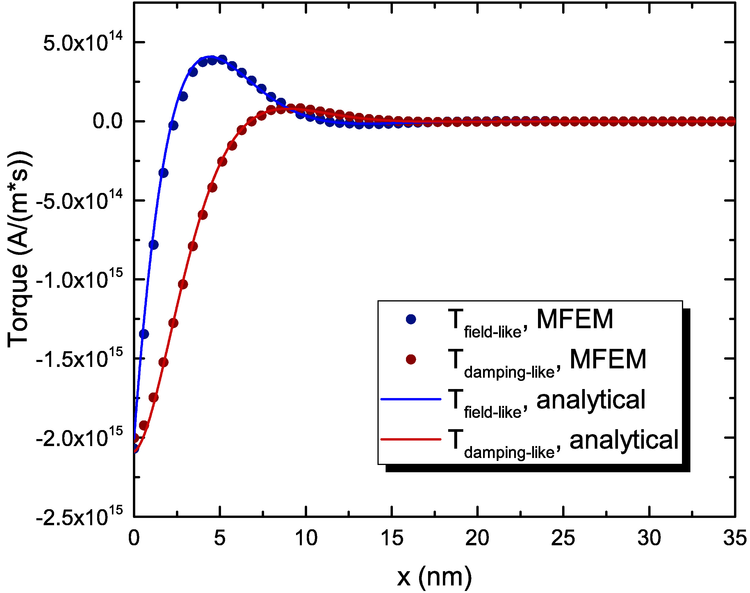 The two results are in perfect agreement, confirming the accuracy of the FE solver. The average damping-like torque acting on the FL obtained from (7.4) is \(T_\text {S,DL} = 2.02 \times 10^{15}\) A/(m s), which is compatible with the value computed using (7.6). The drift-diffusion approach, thanks to the presented effective choice of material parameters, is thus able to reproduce the torque magnitude expected in MTJs.
