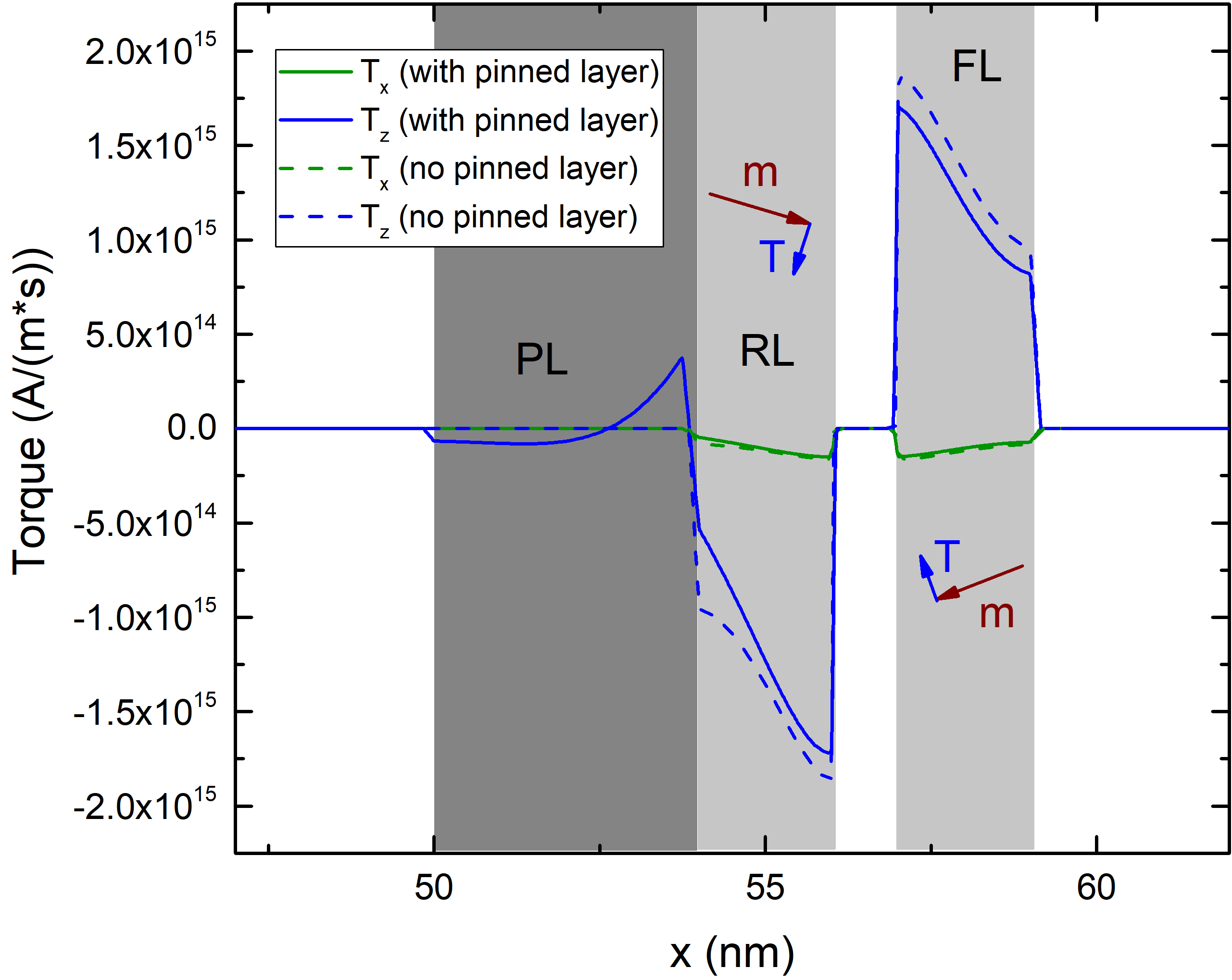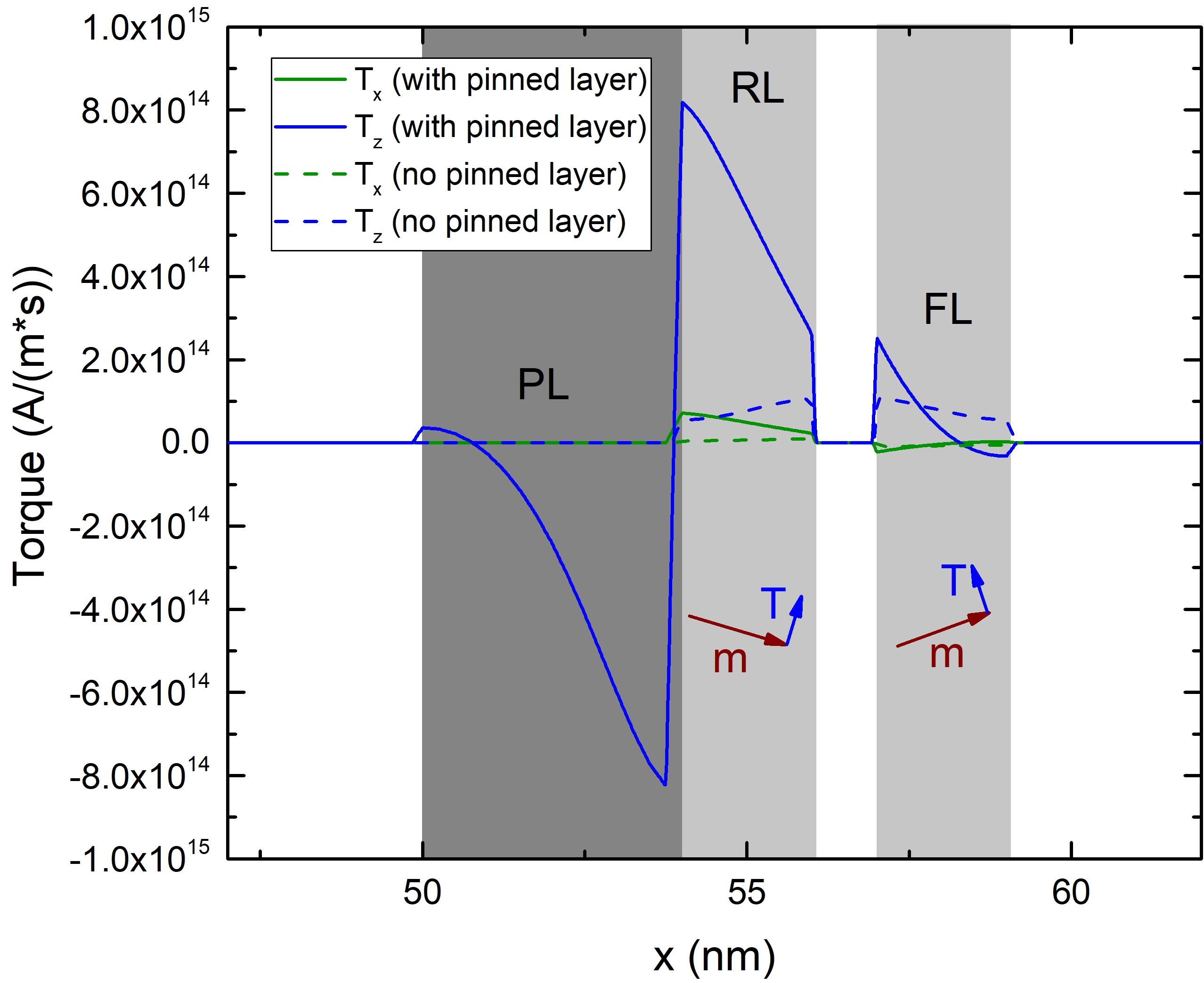 Even though the expressions for the average torque can be employed to simulate the magnetization dynamics of the FL, one of the main advantages of the drift-diffusion approach is the straightforward possibility to compute the torques acting in all the ferromagnetic layers in a given structure. This is particularly useful when the cell under study contains more layers than just the RL and FL. In [153], the writing failure of an MRAM cell at a high current density was linked to the destabilization of the RL. The torque acting from the FL back on the RL can become strong enough to cause the reversal of its magnetization, so that an equilibrium state of the cell is never reached. As seen in Chapter 2, the stability of the RL is usually increased by the presence of a pinning layer antiferromagnetically coupled to it. The effect on the torques acting in the structure in the presence of the additional PL is investigated. As the PL is usually a composite of multiple Co/Pd stacks with antiferromagnetic coupling [12], its polarization parameters are taken to be low, \(\beta _\sigma =\beta _\text {D}=0.1\). The length of the PL is 4 nm, and the spacer layer between RL and FL is 1 nm long. The magnetization is perpendicular to the plane of the structure, pointing along the positive x-direction in the RL and along the negative one in the PL.
