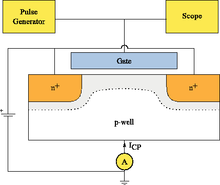 The basic experimental setup for the charge pumping method can be seen in