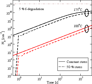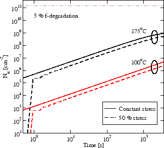 duty cycle of 50 % (dashed lines) and with constant stress (solid lines)