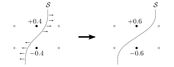 opposite signed surface velocities (arrows) are used. This leads to a neighboring pair of non-active grid points with opposite signed LS values.