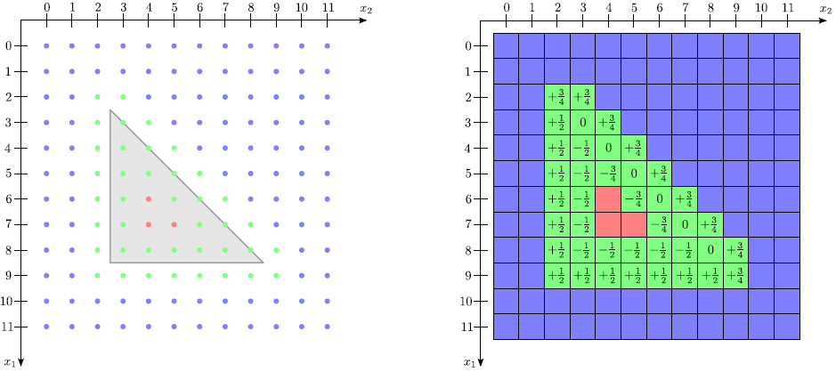 To demonstrate, run-length encoding is applied to the two-dimensional example shown in Figure 3.3. There, a triangle is described by the LS. The LS function is resolved on a grid with extensions