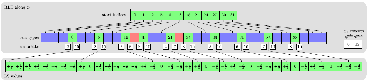 The LS values of all defined grid points are stored in lexicographical order in the LS values array. Sequences of positive undefined, negative undefined, or defined grid points are represented by integral run codes stored within the run types array. In case of a defined sequence the run code gives the corresponding start index in the LS values array. Grid indices at which new runs start are given in the run breaks array. Direct access to run codes for a specific line of grid points is provided by the start indices array. The size of this array is equal to the number of grid lines parallel to the