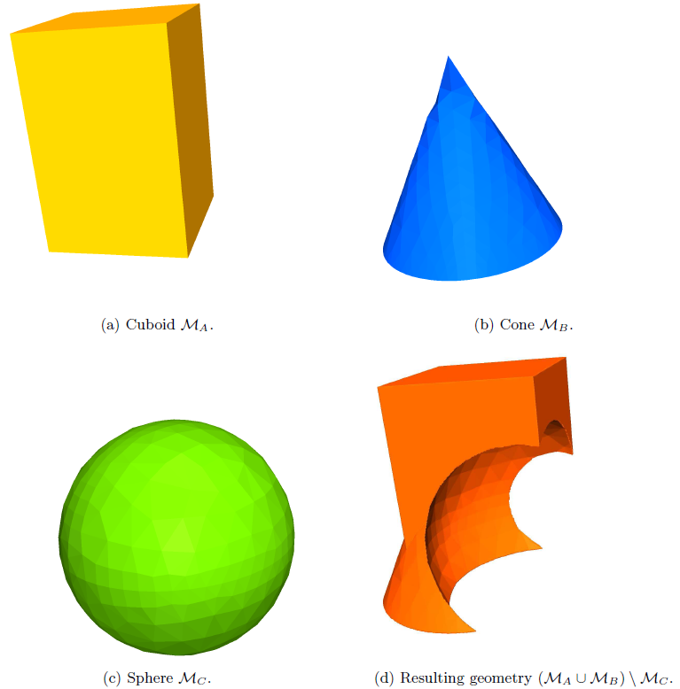 denote the corresponding numbers of defined grid points. The determination of the complement requires only the inversion of the sign. This can be performed without rebuilding the H-RLE data structure, by simply changing the sign of all values in the LS array and interchanging the run codes of all positive and negative undefined runs. The application of Boolean operations on H-RLE data structures is demonstrated in Figure 4.4. It shows the relative complement of a sphere in the union of a cuboid and a cone.
