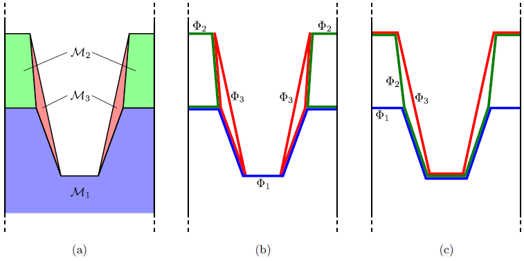 The LS configuration according to (4.19) depends on the numbering of the material regions. For comparison, a different LS representation, obtained through relabeling of the material regions is shown in Figure 4.9. The most suitable LS representation depends on the problem. If the mask is completely removed during the etch process, the configuration given in Figure 4.8c might be better. If underetching of the mask is expected, the LS representation shown in Figure 4.9b is favorable.