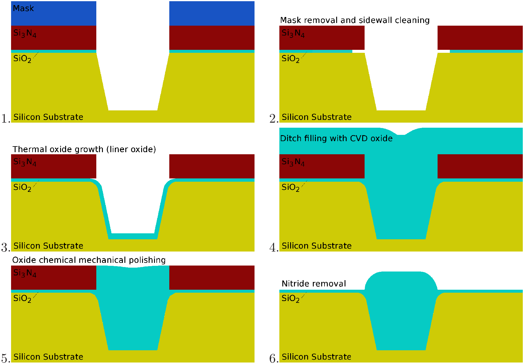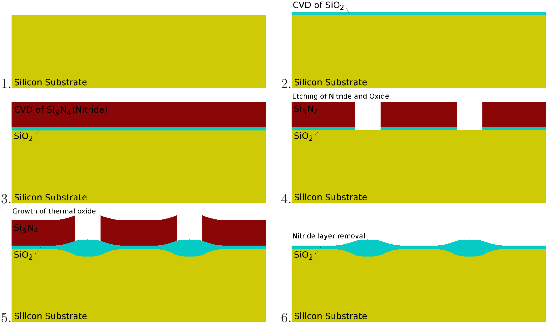 Thick thermally grown oxide is mainly used for isolation in semiconductor devices. The two types of processes which are used in order to isolate neighboring MOS transistors are LOCOS and STI. The general steps required for LOCOS and STI are shown in Figure 2.5 and Figure 2.6, respectively. One aspect of LOCOS which can be noted from Figure 2.5 is that, as the oxide grows, the nitride mask bends to generate a ``bird's beak'' effect as the oxide is pinched under the nitride mask at the edges. For a deeper understanding of these methods, refer to [177]. It is important to note that, although CVD of oxide is possible, as explained above, the quality of deposited oxide is below that of thermally grown oxides. Quality, in this case, refers to the electrical properties of the silicon-oxide interface and the oxide density. Thermal oxidation is also a highly refined process which can be finely controled for oxides below 10nm, unlike deposited oxides [34].