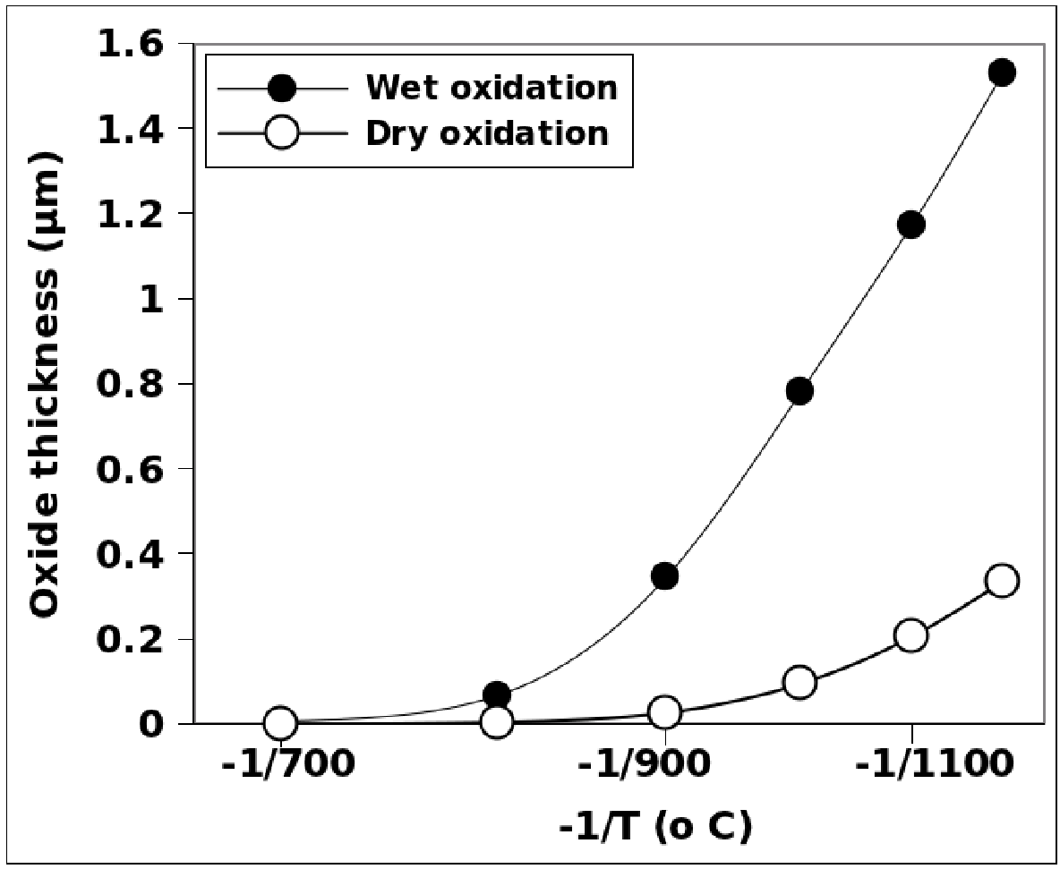 in wet and dry processes. The temperature dependence on the oxidation rate can be observed in Figure 2.7 and
