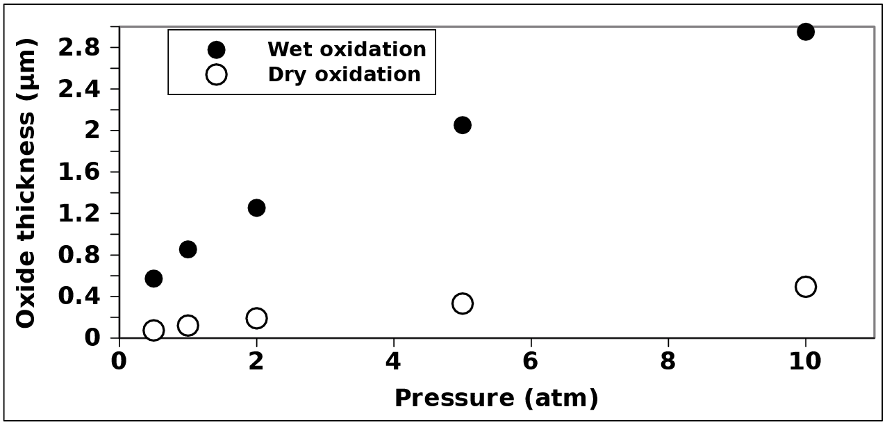The effect of hydrostatic pressure on thermally grown oxides in dry and wet environments is shown in Figure 2.10a