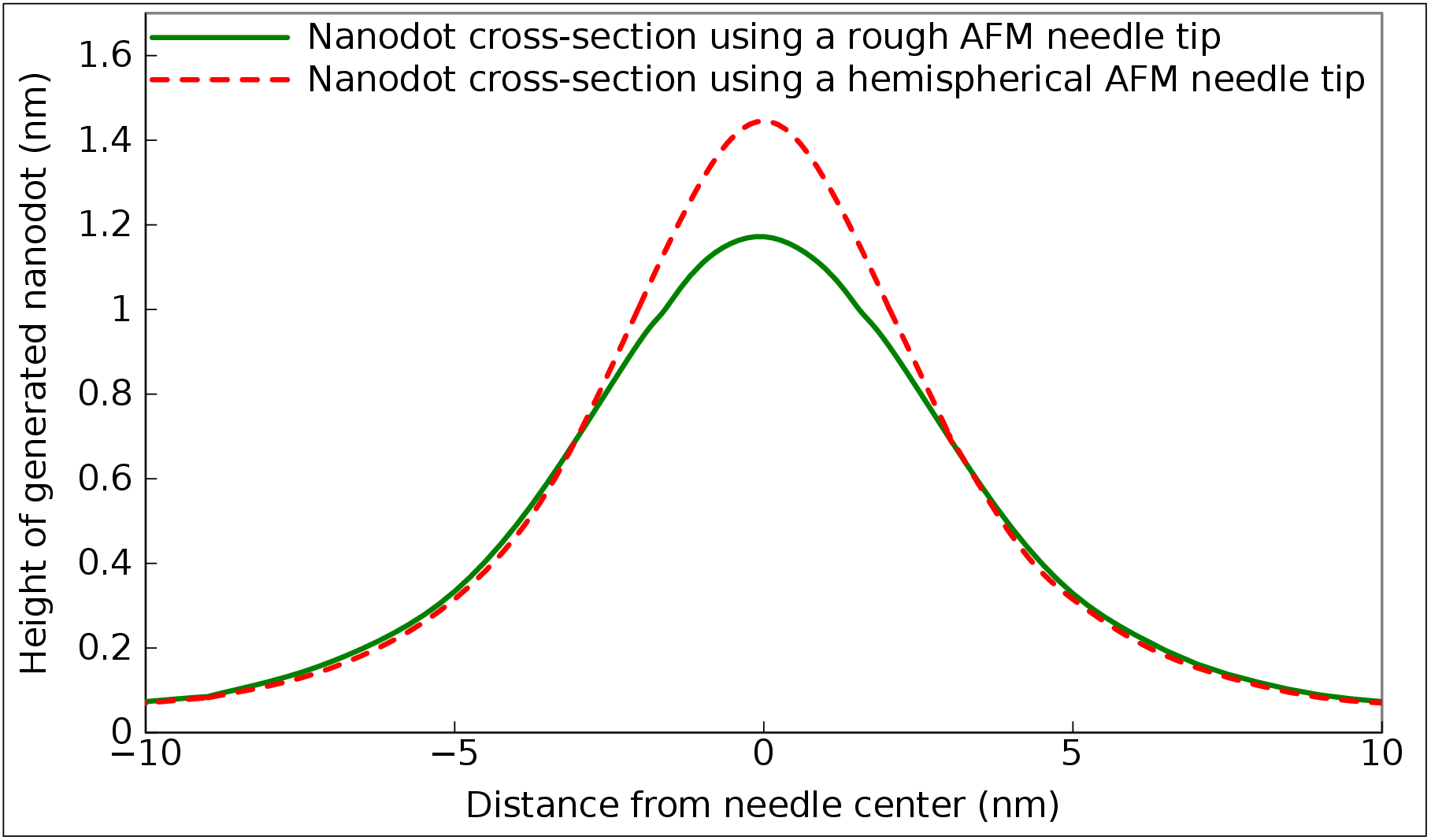 The effective diagonal cross-section height of a nanodot when using a rough AFM needle tip versus a hemispherical AFM needle tip.