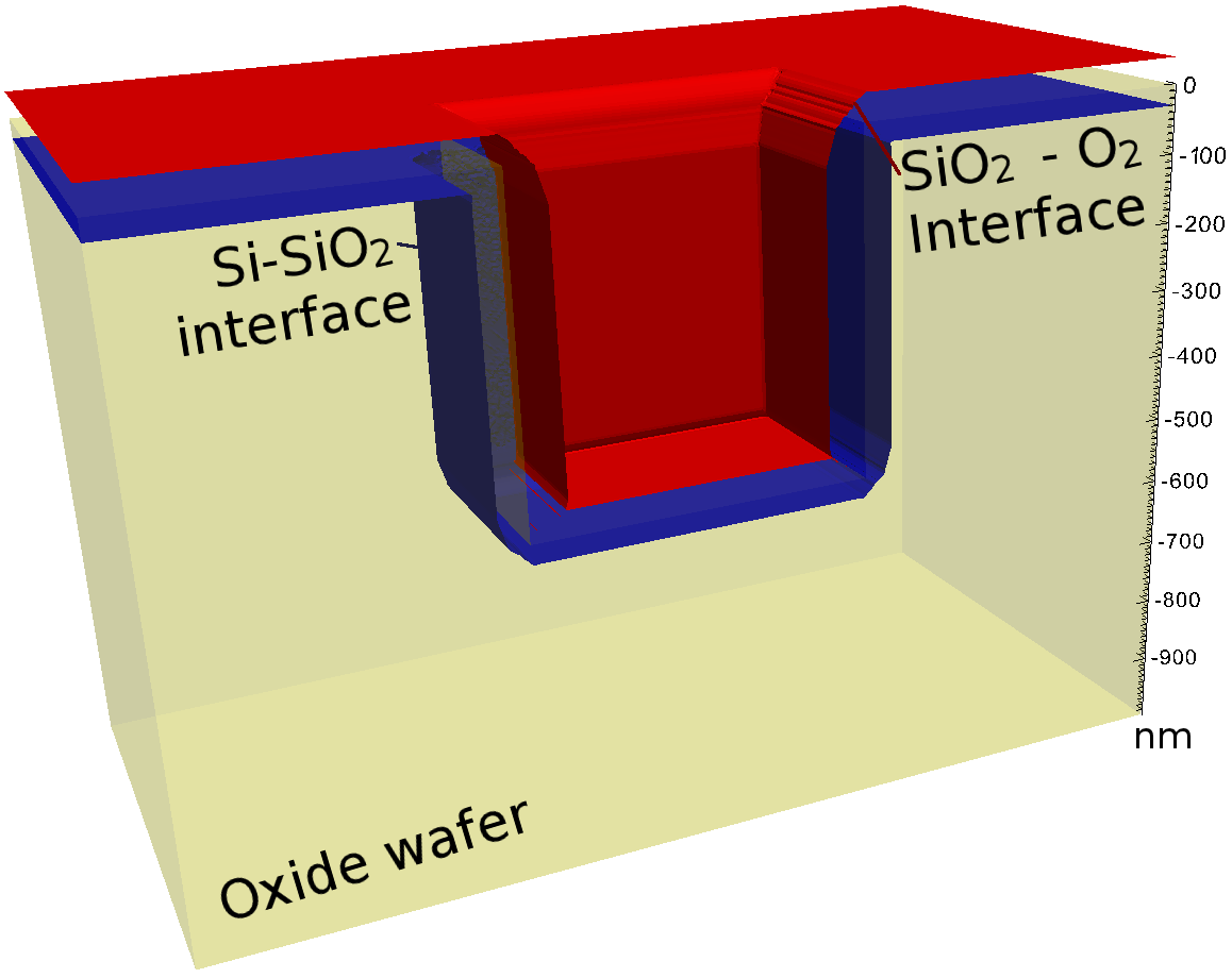 The rate of silicon oxidation depends in part to the orientation of the silicon crystals, as previously discussed in Section 2.2.1 and Section 2.3. Orientation effects can be observed, when oxidizing a trench in a (100) silicon surface. A thicker oxide is expected on the sidewalls since their orientation is (110). This effect is implemented in the presented LS model framework.