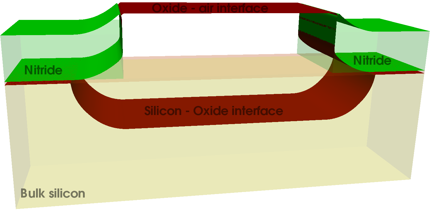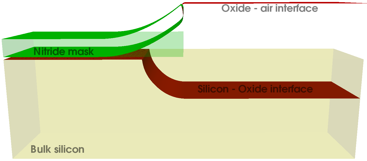 Figure 6.6 depicts a topographical simulation of a nitride mask lifting as thermal oxidation progresses. The geometry of