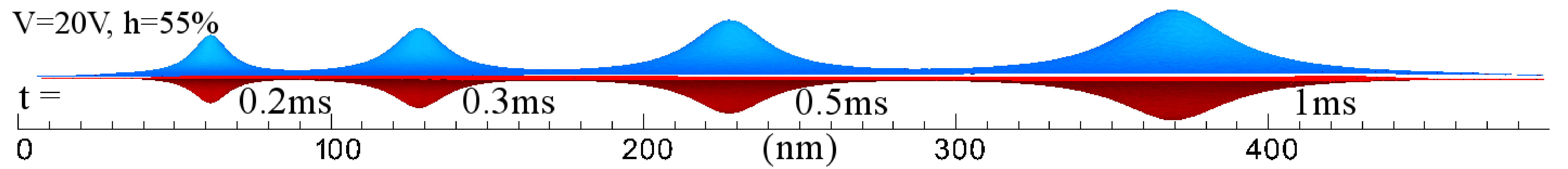 Figure 6.8 shows the distribution of nanodot sizes caused by a variation of pulse times. The voltage and humidity were kept constant at 20V and 55%, respectively, while the time was set to 0.2ms, 0.3ms, 0.5ms, and 1ms. With increasing pulse times, the nanodot height and width also increase, as expected. The height varied from 1.24nm to 2.05nm, while the FWHM varied from 15nm to approximately 50nm with pulse times set to 0.2ms and 1ms, respectively.