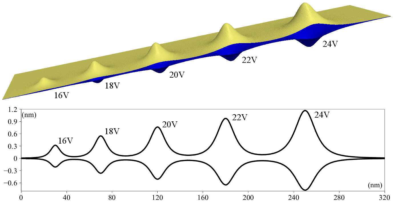 Figure 6.10 shows the distribution of nanodot sizes caused by a variation of the applied voltage. The pulse time and humidity were kept constant at 0.2ms and 55%, respectively, while the voltage was varied at 16V, 18V, 20V, and 22V. With an increasing applied voltage, the nanodot height and width also increase, as expected. The height varied from 0.51nm to 1.58nm, while FWHM varied from 10nm to approximately 18nm with the applied voltage set to 16V and 22V, respectively.
