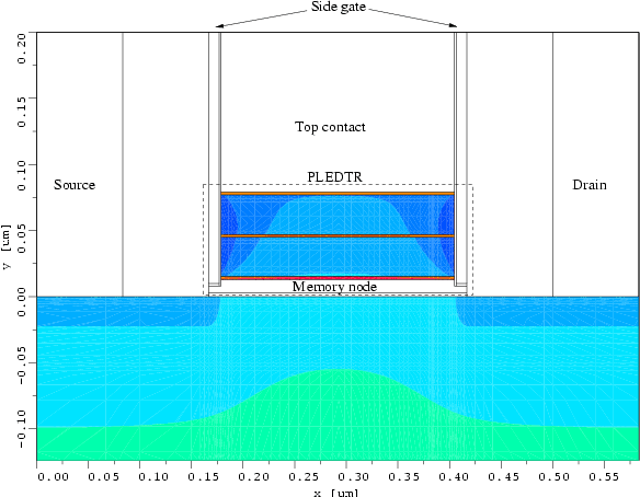 of a top contact bias of 1V and a side gate bias of 2V. The wave function