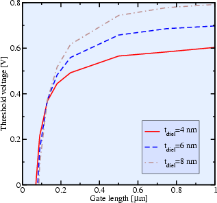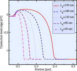 For devices with very short channels, an additional effect occurs which leads to increased leakage current. Due to the short distance between source and drain, the potential at the drain contact reduces the peak value of the energy barrier in the channel. This is shown in the left part of Fig. 2.8 for gate lengths of 250nm down to 50nm. It can be seen that the peak of the energy barrier near the source contact is strongly reduced, an effect which is called drain-induced barrier lowering (DIBL). It leads to a decrease of the threshold voltage with reduced channel length. The resulting values of the threshold voltage for decreasing channel lengths, as shown in the right part of Fig. 2.8, give the so called 'roll-off' curve.
