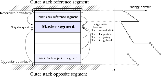 Further quantities which are necessary for tunneling, such as the conduction and valence band edge, the distance from the reference boundary, or the trap concentration, are transferred from each stack member segment to the master segment. A two-dimensional array is built up which describes the quantities in the whole stack region. In the master segment finally the chosen tunneling current model is evaluated and the calculated tunneling current is transferred back to the boundary node and partner node located at the reference and opposite boundary. There it is added to the continuity equation of the neighboring segments or to the contact current in case of metal contacts as described above.