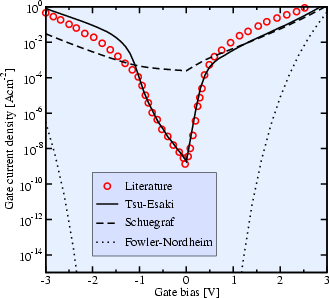 Since the computational effort for the numerical integration in TSU-ESAKI's formula or the evaluation of the quasi-bound states is numerically expensive, it is reasonable to ask if compact models can describe tunneling, at least for single-layer dielectrics. The compact tunneling models outlined in Section 3.7 are compared in Fig. 5.11 for a symmetrical metal-dielectric-metal structure (left) and for an nMOS structure with 3nm dielectric thickness (right). For the metal-dielectric-metal structure, SCHUEGRAF's model yields almost the same results as the computationally much more expensive TSU-ESAKI model. The FOWLER-NORDHEIM model delivers correct values only for high bias. It is thus only applicable to describe high-field transport through gate dielectrics, like program and erase cycles in EEPROM devices. For the MOS structure in the right part of Fig. 5.11, the SCHUEGRAF model fails to describe the tunneling current density at low bias. For high bias, however, it may be used to provide an estimation of the gate current. The FOWLER-NORDHEIM model totally fails for this application. Furthermore, the FOWLER-NORDHEIM model shows the minimum gate current at minimum electric field in the dielectric, and not for the minimum gate bias.