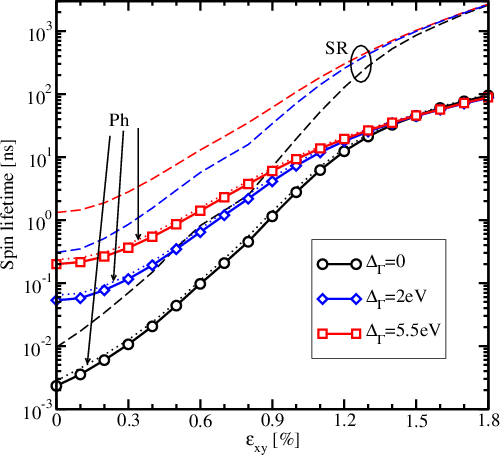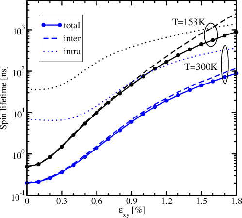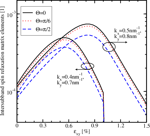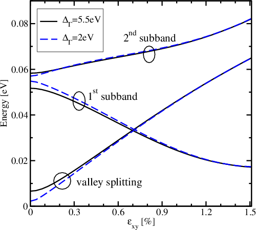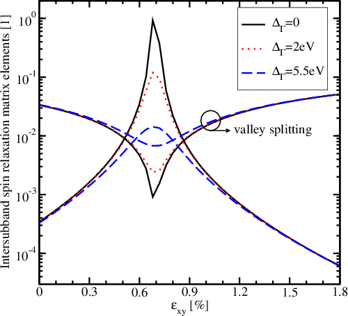 The [001] equivalent valley coupling through the Γ-point results in a subband splitting in confined electron structures [87]. This subband splitting is not limited to strained structures and thus must be taken properly into account for the calculation of the spin lifetimes in relaxed structures as well. The valley splitting in a silicon quantum well at zero strain as a function of the quantum well width has been studied for a long time. The expression for the valley splitting can be written as [55]