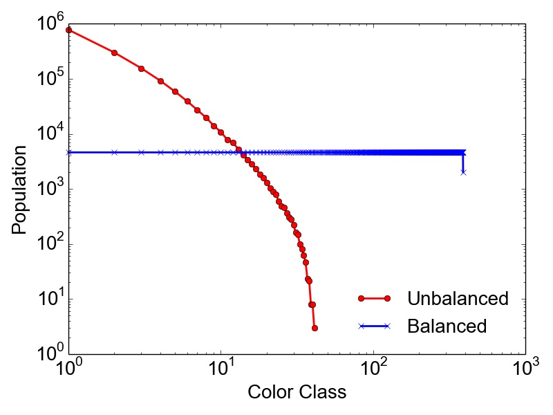 Here, \(s\) denotes the standard deviation and \(\bar {x}\) the average population of the color classes. An example of a balanced and an unbalanced graph coloring solution obtained for a graph with 1,800,000 vertices and 19,000,000 edges, together with the corresponding RSD values, is depicted in Figure 2.4. The presented data prove that a balanced coloring usually requires more color classes than an unbalanced coloring. However, the balanced approach yields almost equitable color classes, where only the highest class(es) have smaller populations.