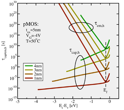 Tewksbury[23] assumed elastic tunneling of electrons and holes into and out of oxide defects as the mechanism responsible for charge trapping. The use of his model has been suggested by Huard et al. [58] in order to explain the recoverable part of the NBTI degradation. In this section, Tewksbury’s model will be reviewed, extended for an application of present-day devices with small gate thicknesses, and referred to as the elastic tunneling model (ETM) in the following.