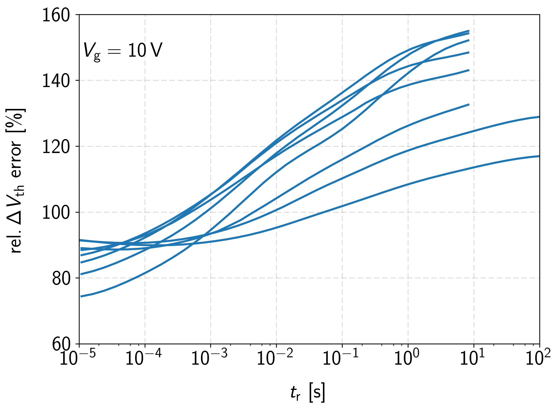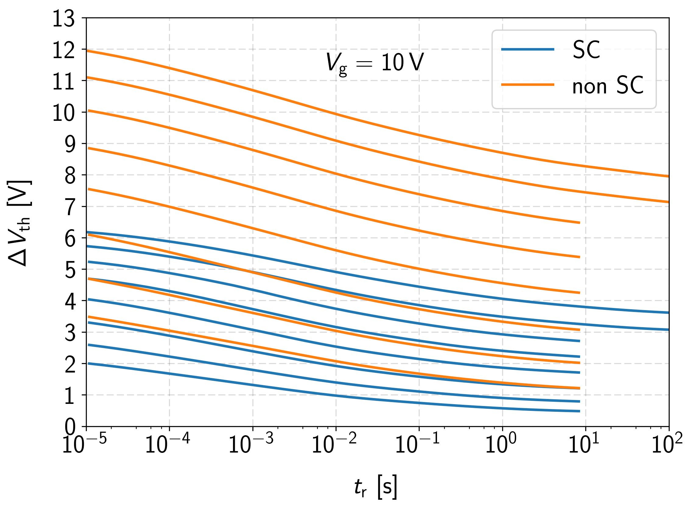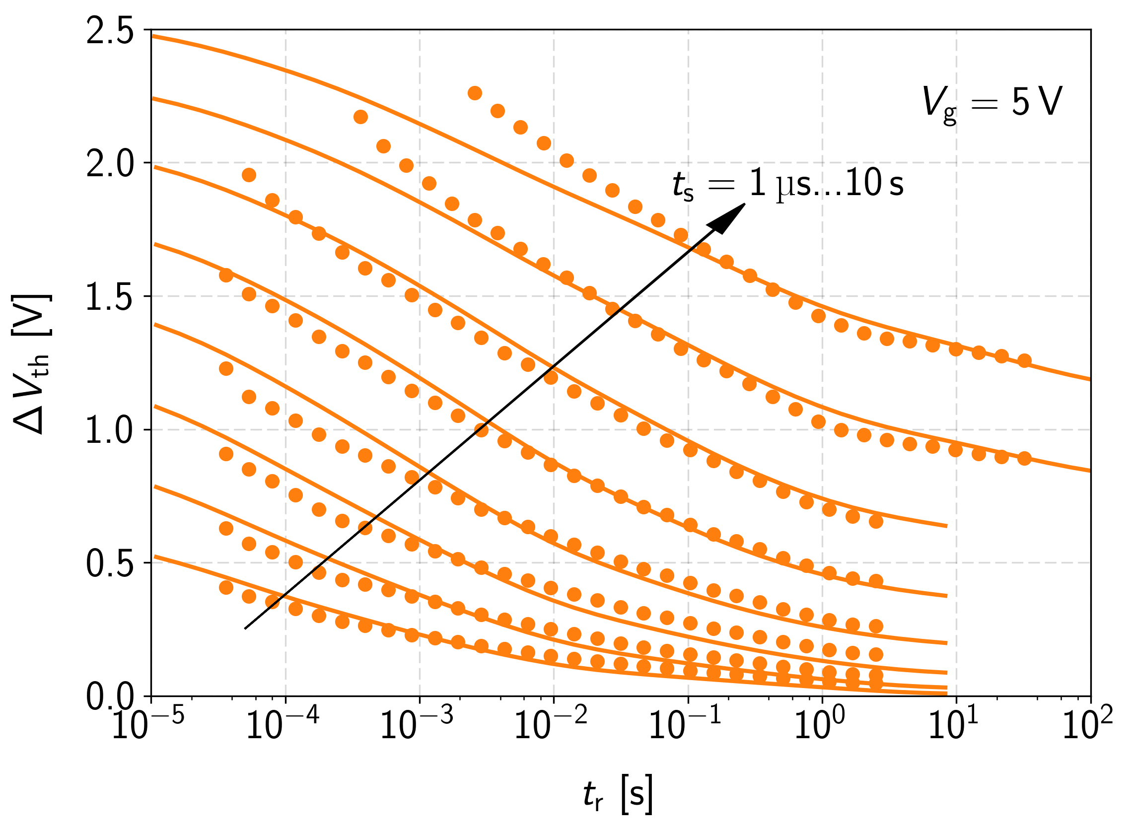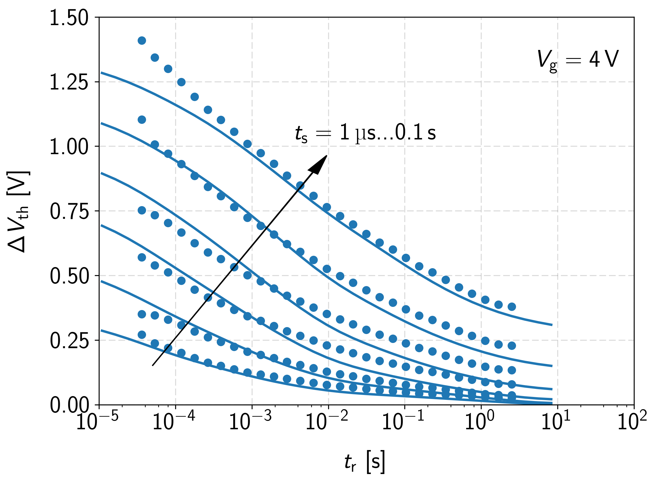 Due to these effects, modeling approaches like the usage of accumulated stress times cannot be used as the observed defect kinetics are a strong function of previous stress and recovery cycles in the device. Thus, for this kind of devices, it is of utmost importance to use transient simulations following the experimental bias conditions as closely as possible.