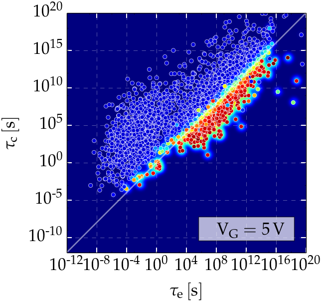 The residual amount of trapped charges of course strongly depends on the applied stress voltage, the stress time and the recovery period allowed between two subsequent stress cycles. In the second row of Figure 7.8 the defects after the last stress cycle are plotted. Electrostatic charge feedback, which was explained in the last paragraph, then already caused a significant shift of the time constants towards larger values. The asymptotic limit of this mechanism can be seen in the third row, where the thermodynamic equilibrium of the defects is shown. Note that the shift of the time constants as compared to the transient results covers additional five orders of magnitude.