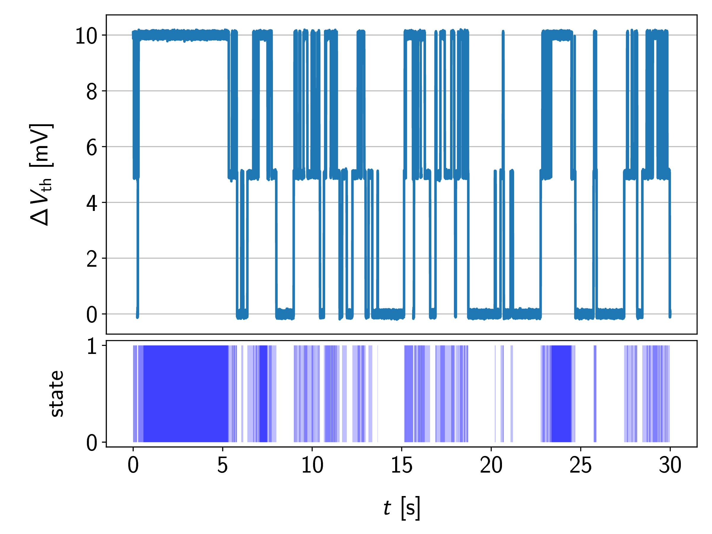 An example for an even more complex RTN signal commonly called three-level anomalous RTN, is given in Figure 6.4. Here the Markov state is charged negatively, while the states