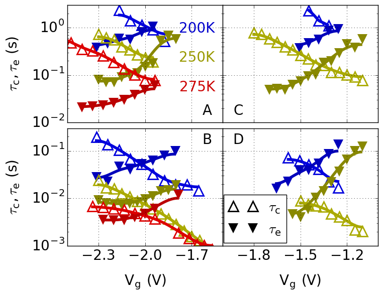 proximity to each other. For the same reason, they also share the same trap levels although the observed time constants differ by one order of magnitude. The only remaining parameters to describe the differing time constants are the exponential pre-factor . It can be seen that the factors differ by two orders of magnitude between the slow and fast time constants, while the two defect pairs almost share the same pre-factors.