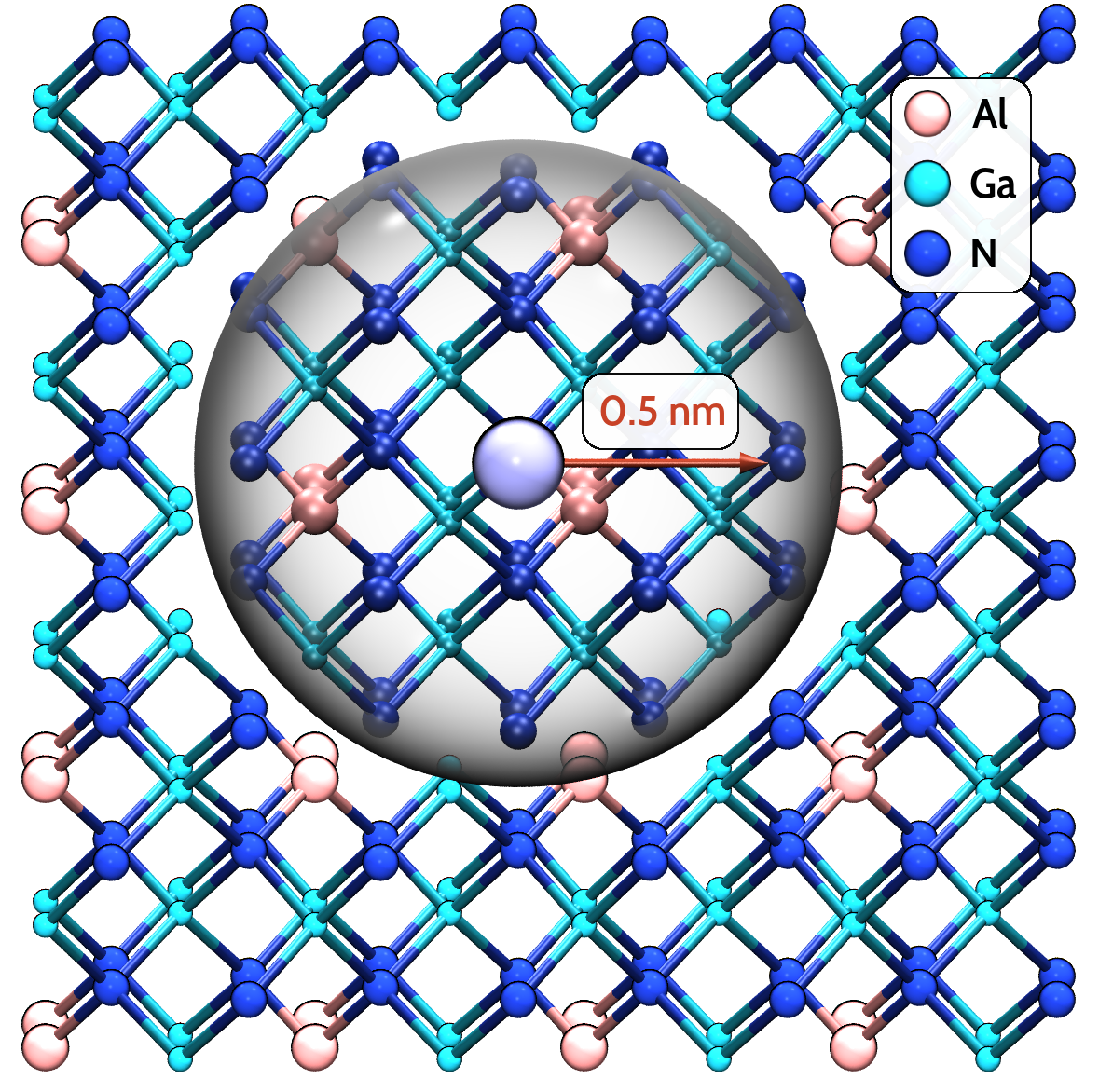 . From the crystal structure in Figure 7.21, the worst-case distance between two nitrogen sites not sharing the same Ga atom was calculated to be around 5 Å, thus the