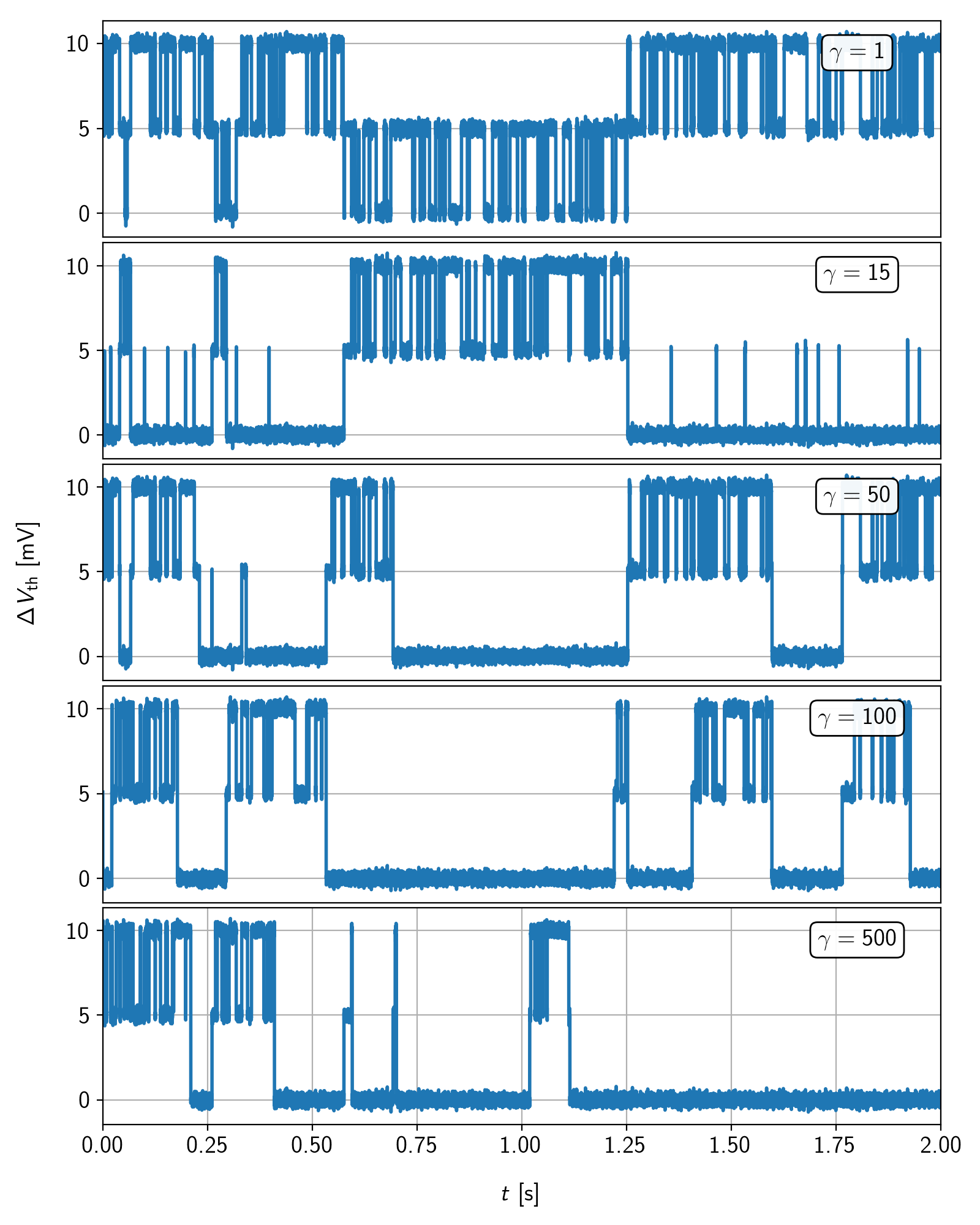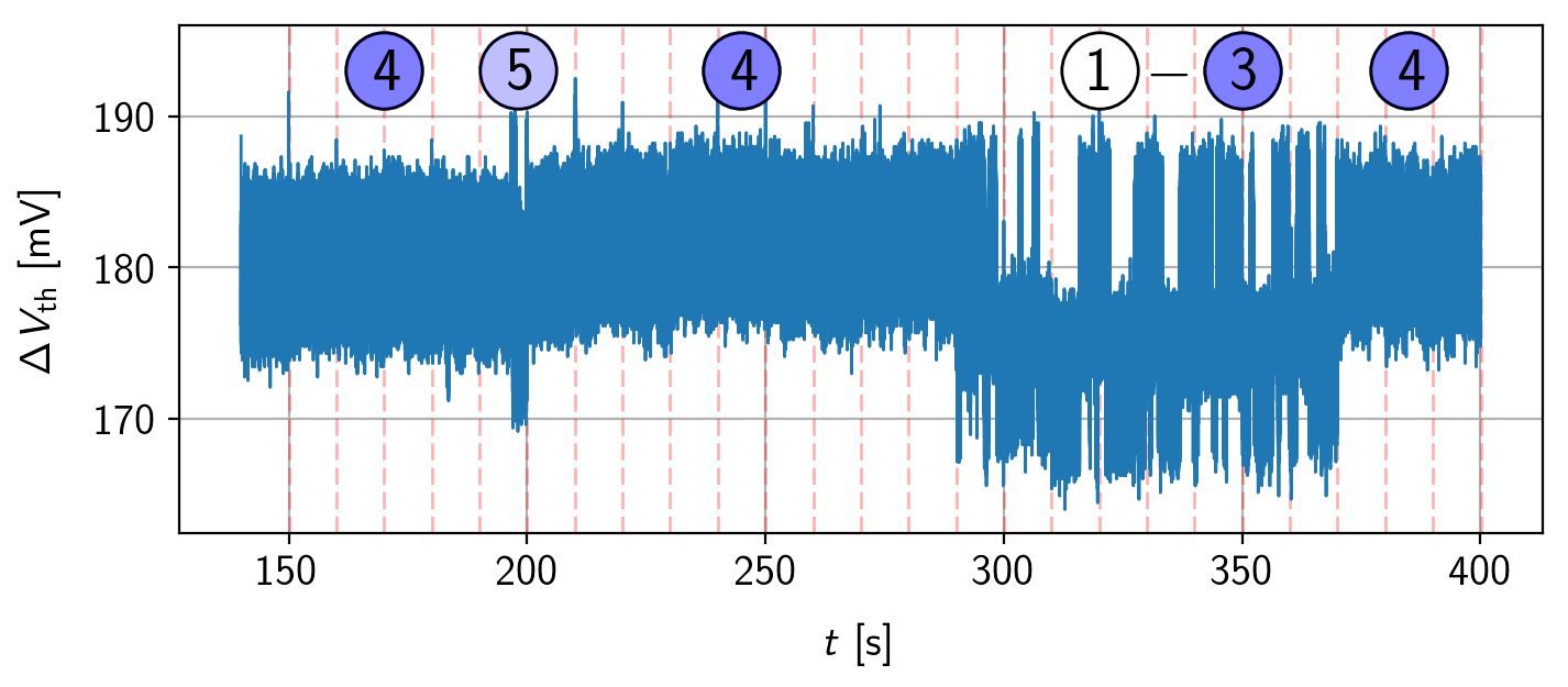 Figure 7.23 shows the measurement data from 50 subsequent RTN measurements used to extract the time constants of traps ‘A’ and ‘B’ in Section 7.2.2, merged together into one trace. It can be seen that the RTN signal becomes inactive from time to time, which is usually referred to as anomalous RTN [108, 112, 113].