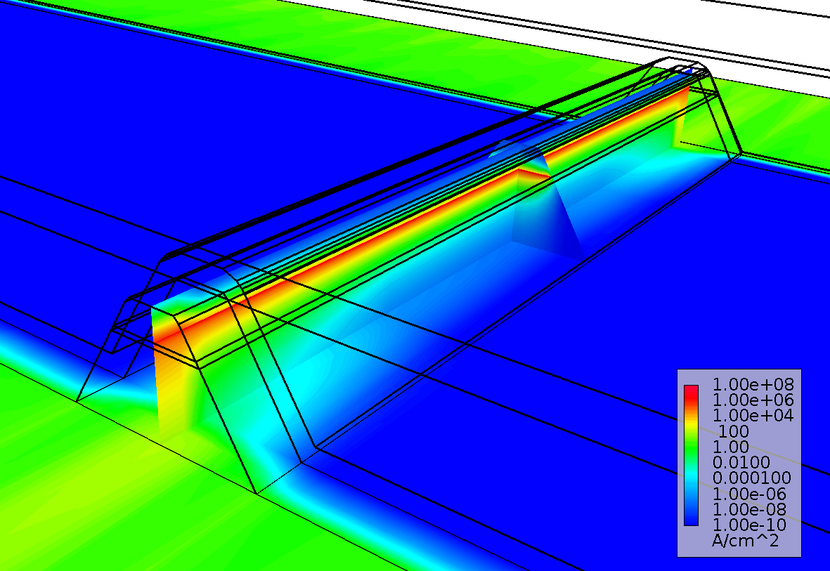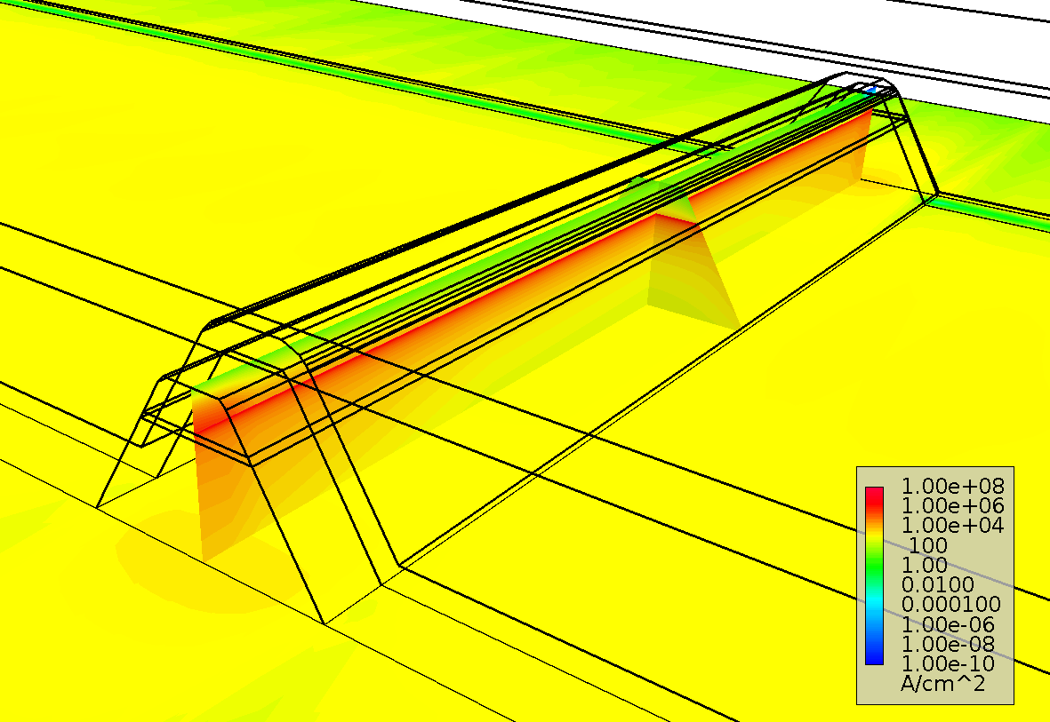 The two operating regimes, regular 2DEG conduction and sidewall accumulation are shown in Figure 7.11. The 3D-simulations were carried out with Minimos-NT [21] on a simplified geometry where the access regions as well as the source and drain regions were scaled in order to speed up the computations. The piezoelectric charges at the hetero-interface were chosen according to [192] and a thermionic field emission model was used to calculate the transfer of electrons and holes across the heterointerface at the channel. The doping concentrations and the compensation of the piezoelectric charges at the barrier-oxide