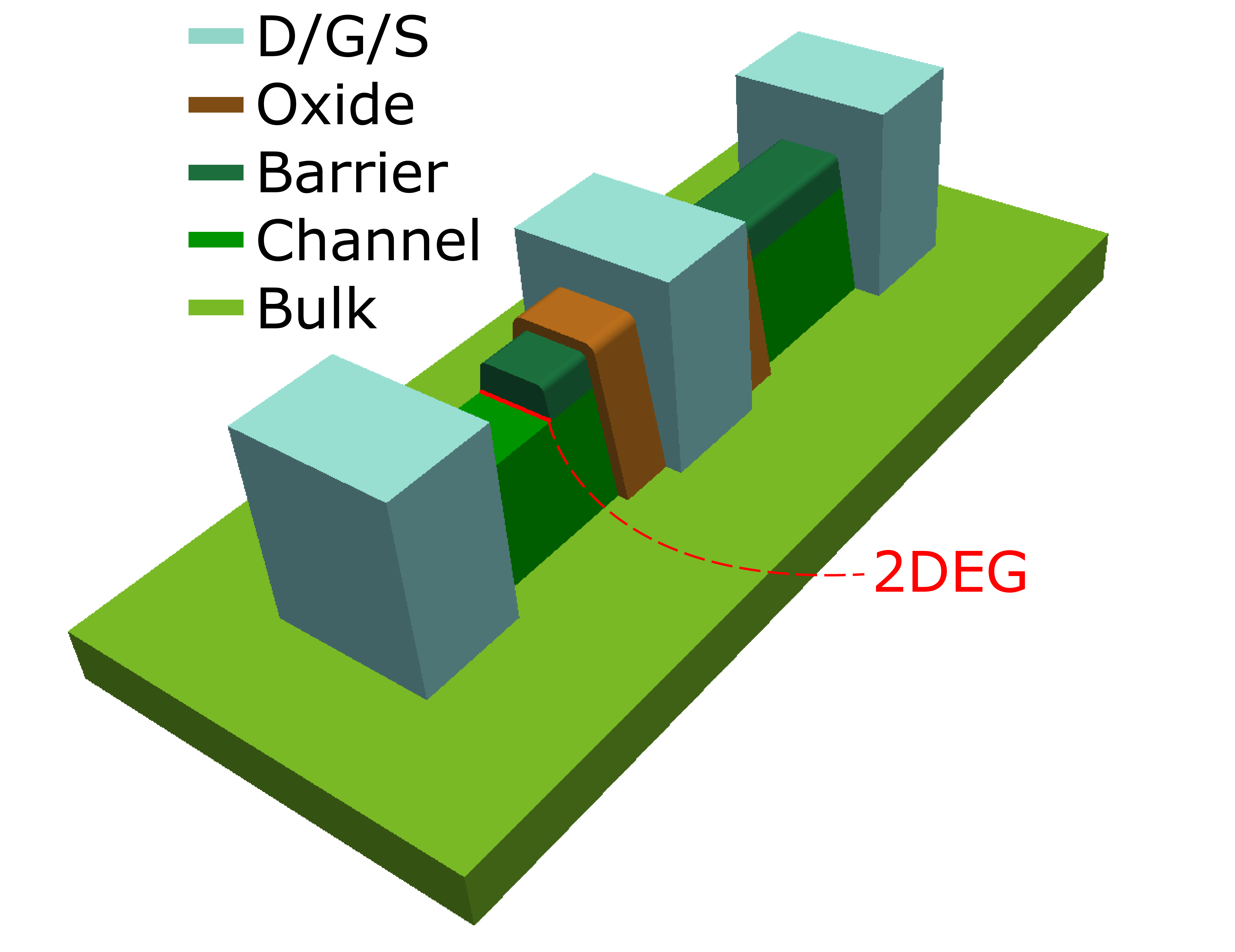 Unlike the devices investigated in [204] which were fabricated with Schottky gates, the devices in this work were insulated by a 20 nm thick high-quality aluminum oxide layer. The HEMT was formed by a 30 nm thick AlGaN barrier (30% Al) on top of a 80 nm GaN channel layer and a 2 µm thick highly resistive GaN buffer. The lateral dimensions of the fin were about 50 nm x 1 µm.