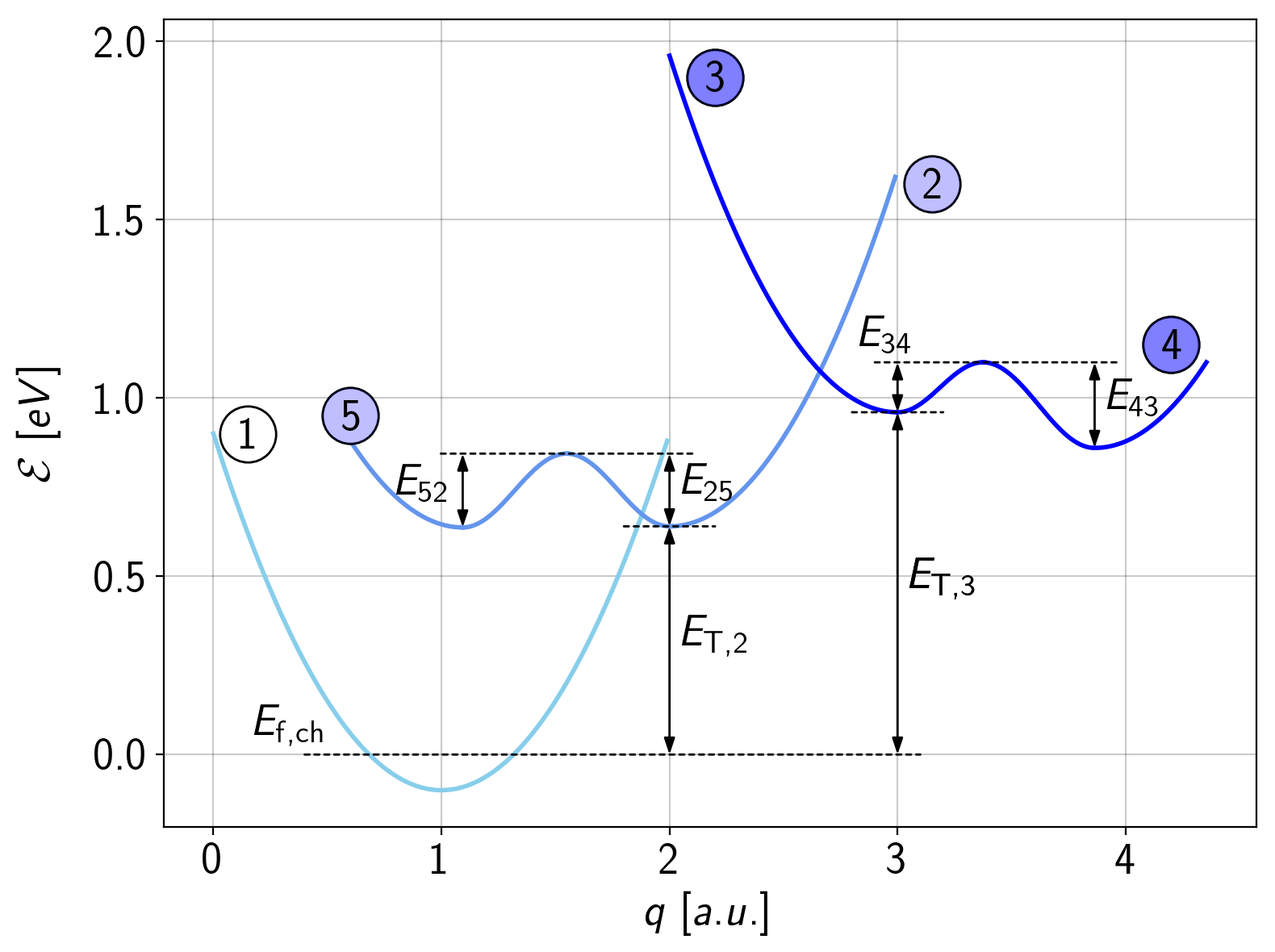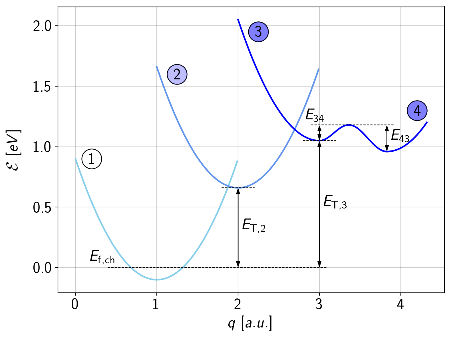 Another thing which can be extracted from the measurements is the temperature activation of the process. When assuming equal curvatures of the parabolas from the two-state NMP process, the energy barriers for electron capture and emission can be calculated from the energy barriers for the relaxation energy and the minimum-energy difference