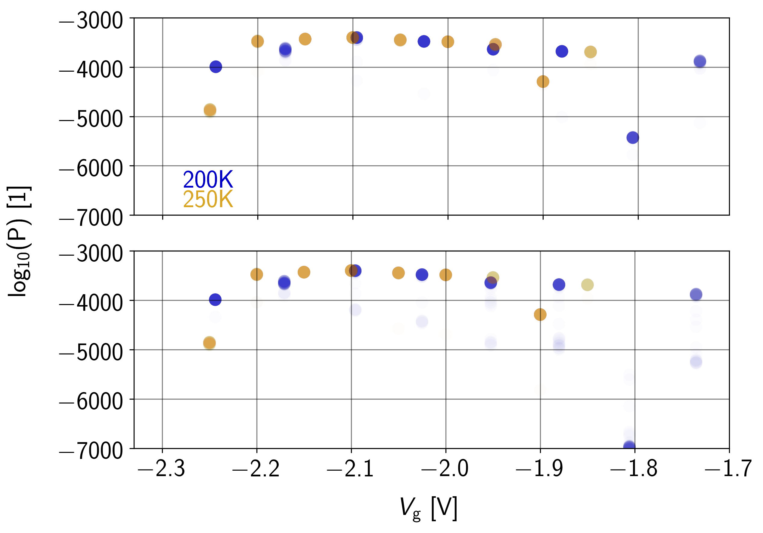 On this occasion it should be stressed that a proper selection of the Markov chains is one of the most important tasks because HMM training does not include any physical reasoning. In other words, the HMM will always stick to the pre-selected defect structure no matter how unlikely a sequence of observations will be. Sometimes the MAP probability is used to determine the number of (two-state) defects [223]. This is however a problematic approach since more defects (i.e. more levels) tend to match the long-term drift and measurement noise better and thus will have a larger probability. The best solution to this problem is to compare the temperature and bias dependence of the individual defects or defect states and judge if the Markov training delivers physically reasonable results.